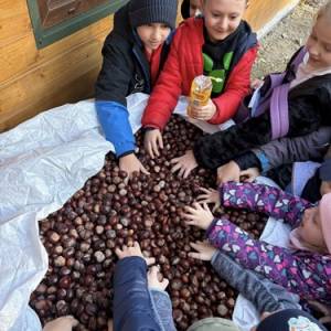 Zakończyliśmy naszą jesienną akcję zbierania kasztanów, żołędzi i darów jesieni dla zwierząt na zimę! Z ogromną radością informujemy, że udało się zebrać aż 647 kg! Serdecznie dziękujemy wszystkim uczestnikom za zaangażowanie i wielkie serca. Wczoraj mieliśmy przyjemność gościć w Leśniczówce, gdzie Koło Łowieckie „Podgórskie” serdecznie nas przyjęło. Dziękujemy za ciepłe powitanie, wspaniałe nagrody, pyszny poczęstunek i miło spędzony czas. Dzieci dowiedziały się wiele o pracy myśliwego, o zwierzynie i o lesie. Podczas spaceru do paśników mogły samodzielnie wsypać zebrane kasztany, a przy okazji znalazły też w lesie kilka grzybów. Pogoda dopisała, a uśmiechy nie schodziły z twarzy– to był naprawdę udany dzień!