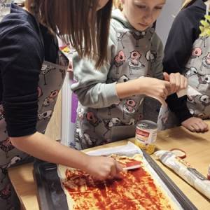 W klasie 5 zapachniało prawdziwą włoską kuchnią! Uczniowie wzięli udział w wyjątkowych zajęciach kulinarnych, podczas których wspólnie przygotowali pyszną pizzę. Od samego początku było sporo pracy – trzeba było odmierzyć składniki, pokroić dodatki itd. Każdy miał swoje zadanie, a współpraca przebiegała doskonale. Podczas wspólnego pieczenia uczniowie przekonali się, że gotowanie to nie tylko sposób na smaczny posiłek, ale też świetna okazja do współdziałania, rozmowy i dobrej zabawy. W szkolnej kuchni panowała radość, śmiech i zapach pieczonego ciasta, który przyciągnął niejednego ucznia i nauczyciela. Kiedy pizza trafiła do piekarnika, uczniowie z niecierpliwością czekali na efekt swojej pracy. Gdy wreszcie nadszedł moment degustacji, nikt nie miał wątpliwości – wyszło przepysznie! Każdy kawałek smakował wyjątkowo, bo przygotowany był z zaangażowaniem i współpracą całej klasy. Okazało się, że wspólna praca daje najlepsze efekty – pizza była przepyszna, a każdy mógł spróbować swojego kulinarnego dzieła. Nie brakowało śmiechu, rozmów i dobrego humoru – każdy chciał dołożyć swoją „cząstkę” do wspólnego wypieku. To był dzień pełen uśmiechu, zaangażowania i smaku, który na długo zostanie w pamięci piątoklasistów!