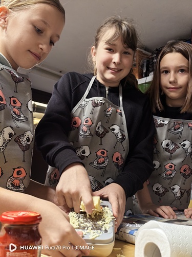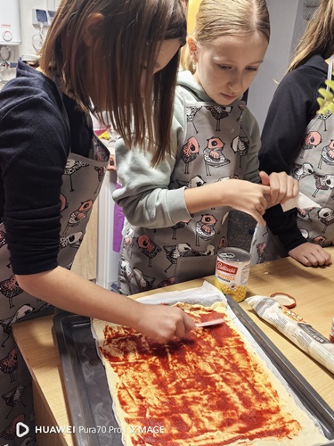 W klasie 5 zapachniało prawdziwą włoską kuchnią! Uczniowie wzięli udział w wyjątkowych zajęciach kulinarnych, podczas których wspólnie przygotowali pyszną pizzę. Od samego początku było sporo pracy – trzeba było odmierzyć składniki, pokroić dodatki itd. Każdy miał swoje zadanie, a współpraca przebiegała doskonale. Podczas wspólnego pieczenia uczniowie przekonali się, że gotowanie to nie tylko sposób na smaczny posiłek, ale też świetna okazja do współdziałania, rozmowy i dobrej zabawy. W szkolnej kuchni panowała radość, śmiech i zapach pieczonego ciasta, który przyciągnął niejednego ucznia i nauczyciela. Kiedy pizza trafiła do piekarnika, uczniowie z niecierpliwością czekali na efekt swojej pracy. Gdy wreszcie nadszedł moment degustacji, nikt nie miał wątpliwości – wyszło przepysznie! Każdy kawałek smakował wyjątkowo, bo przygotowany był z zaangażowaniem i współpracą całej klasy. Okazało się, że wspólna praca daje najlepsze efekty – pizza była przepyszna, a każdy mógł spróbować swojego kulinarnego dzieła. Nie brakowało śmiechu, rozmów i dobrego humoru – każdy chciał dołożyć swoją „cząstkę” do wspólnego wypieku. To był dzień pełen uśmiechu, zaangażowania i smaku, który na długo zostanie w pamięci piątoklasistów!