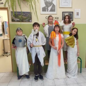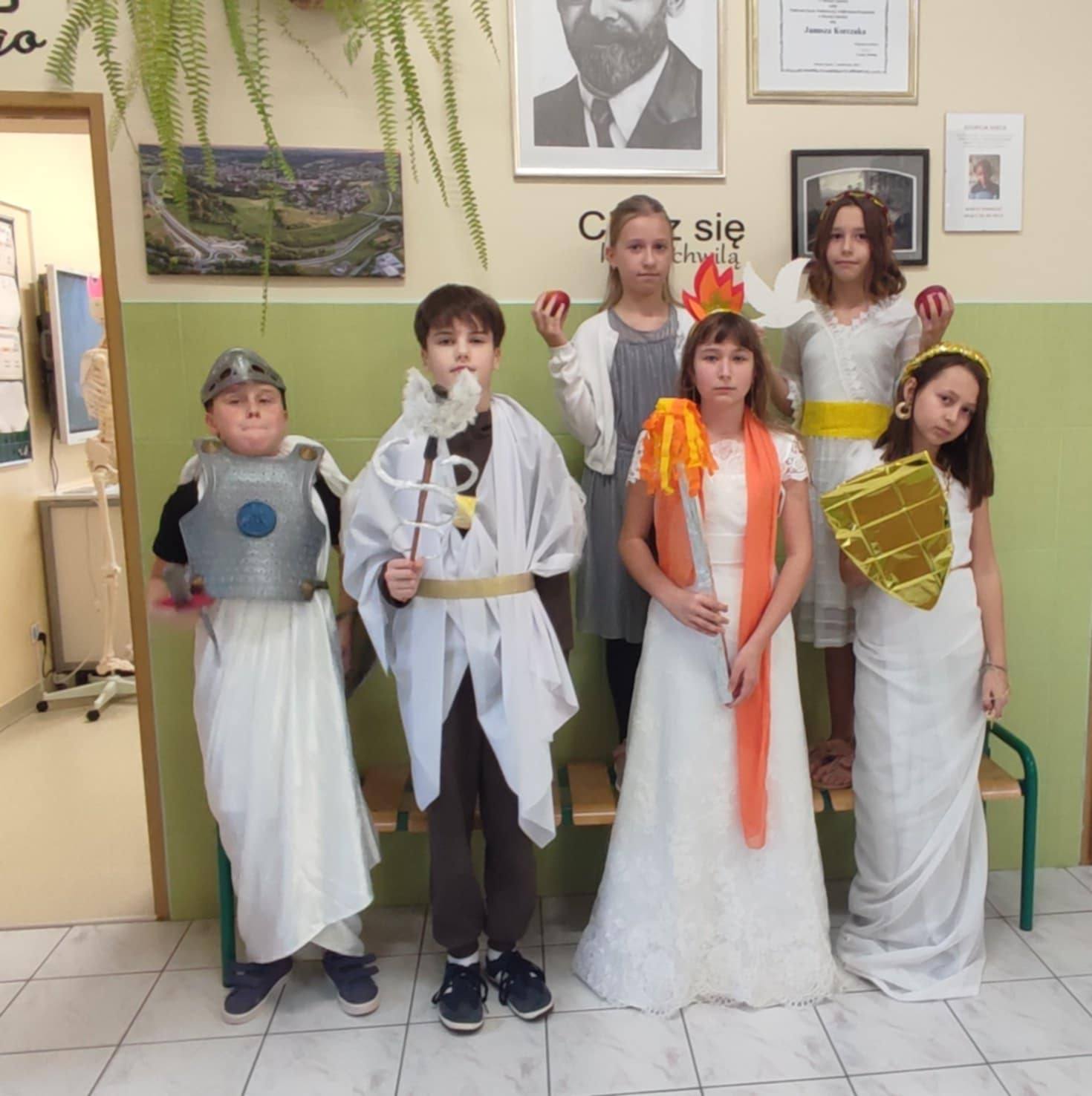 Podczas lekcji historii poświęconej religii w starożytnej Grecji uczniowie klasy V zamienili szkolną salę w prawdziwy Olimp. W ramach nietypowych zajęć przebrali się za greckich bogów i boginie, prezentując ich role, dziedziny życia, którymi się opiekowali, oraz charakterystyczne atrybuty.