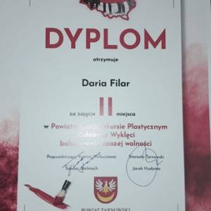 Daria odebrała dziś dyplom i nagrodę podczas powiatowych obchodów Narodowego Dnia Pamięci Żołnierzy Wyklętych, które odbyły się w Tuchowie. Uczennicy gratulujemy z całego serca tego wyróżnienia! Wiemy, że nasze pochwały nieco bledną przy gratulacjach, które złożył Darii były prezydent RP Andrzej Duda, goszczący w Tuchowie na uroczystości, ale i tak podkreślamy, że jesteśmy pod wrażeniem jej talentu!