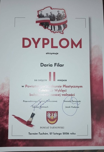 Daria odebrała dziś dyplom i nagrodę podczas powiatowych obchodów Narodowego Dnia Pamięci Żołnierzy Wyklętych, które odbyły się w Tuchowie. Uczennicy gratulujemy z całego serca tego wyróżnienia! Wiemy, że nasze pochwały nieco bledną przy gratulacjach, które złożył Darii były prezydent RP Andrzej Duda, goszczący w Tuchowie na uroczystości, ale i tak podkreślamy, że jesteśmy pod wrażeniem jej talentu!