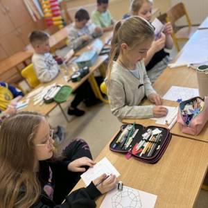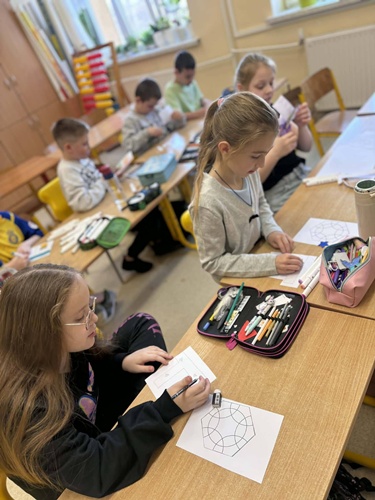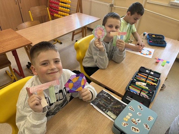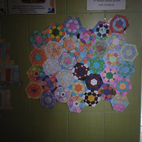 Uczniowie stali się prawdziwymi badaczami matematyki — samodzielnie odkrywali rozwinięcie liczby π, mierząc obwody okręgów i dzieląc je przez ich średnice. W efekcie mogli „dotknąć” matematyki w praktyce i przekonać się, skąd bierze się ta niezwykła liczba. Powstał również efektowny parkietaż z sześciokątów układających się w koła, parkietaż z liczby pi oraz kreatywne „pi-miasto na niebie”, które zachwycało pomysłowością i wyobraźnią.