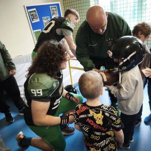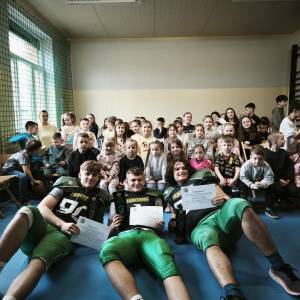 Dziś w naszej szkole odbyło się szóste spotkanie z cyklu “Spotkaj Gwiazdę Sportu". Naszymi gośćmi byli Reprezentanci Polski do lat 19 w futbolu amerykańskim i zawodnicy Hunters Tarnów Alan Kaczmarczyk, Maciej Ciurkot oraz Oskar Brzeziński. Razem z nimi przyjechali do nas trenerzy i Pani koordynator zespołu z Tarnowa. Nasi uczniowie zgłębili tajniki tej widowiskowej dyscypliny sportowej, a także uczestniczyli w profesjonalnym treningu futbolu amerykańskiego przeprowadzonym przez naszych gości. Dziękujemy bohaterom tego spotkania za bardzo inspirujący dzień.