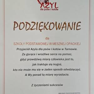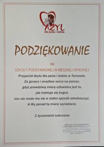 W imieniu własnym oraz Schroniska dla Psów i Kotów “Azyl" w Tarnowie składamy serdeczne podziękowania dla Dzieci, Uczniów i Rodziców naszej szkoły i przedszkola za wsparcie akcji charytatywnej pomocy dla porzuconych zwierząt.